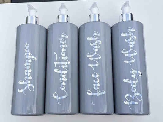 Toiletries Shower Bottles 500ml | Grey and Chrome Bottles | Skin Care | Organisation| Personalised Labels | Mrs Hinch | Mr and Mrs