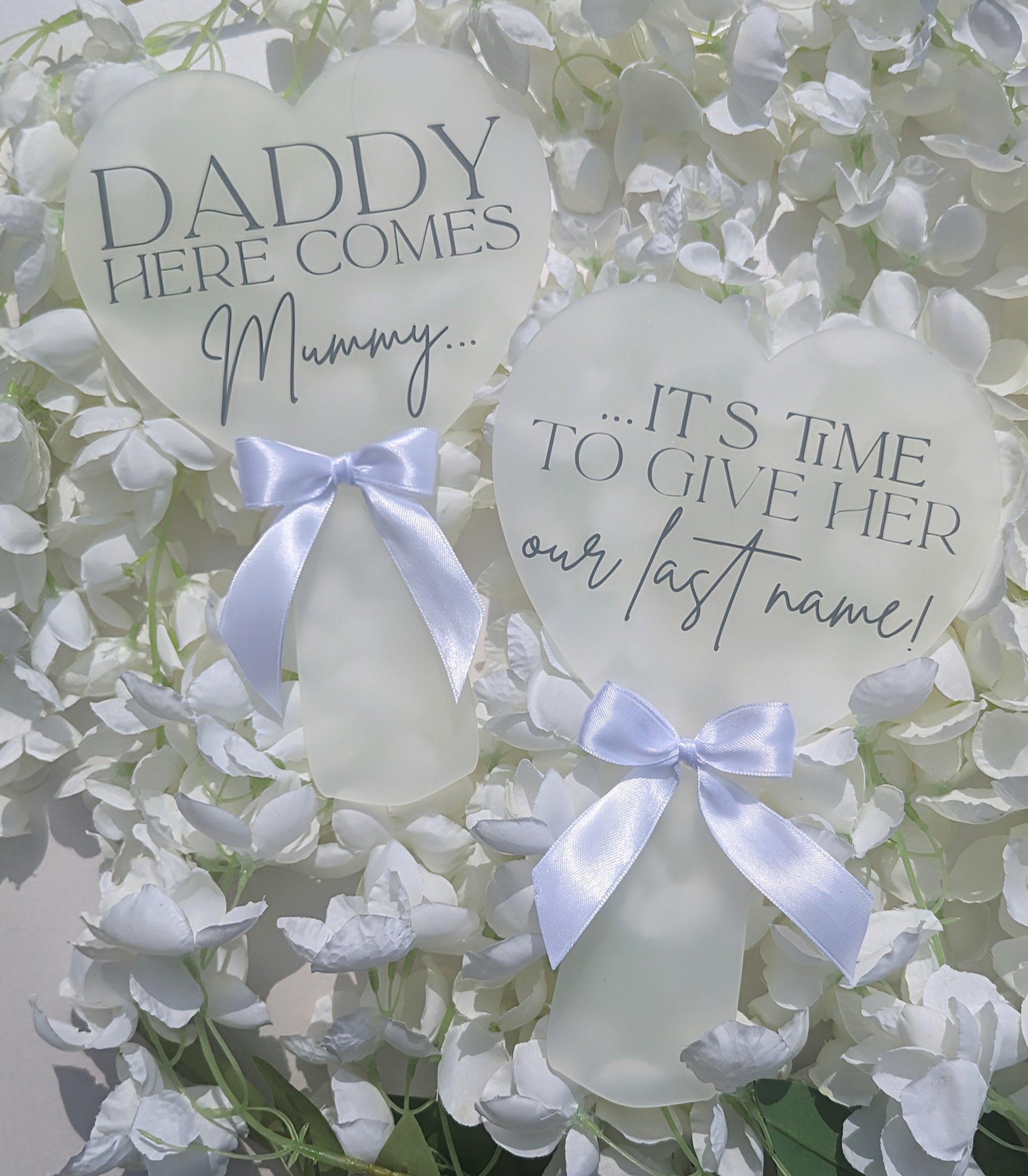 Kids Wedding Aisle Paddle Sign | Daddy Here Comes Mummy | Daddy Let's Give Mummy our last Name | Flower Girl Sign | Page Poy, Usher Sign